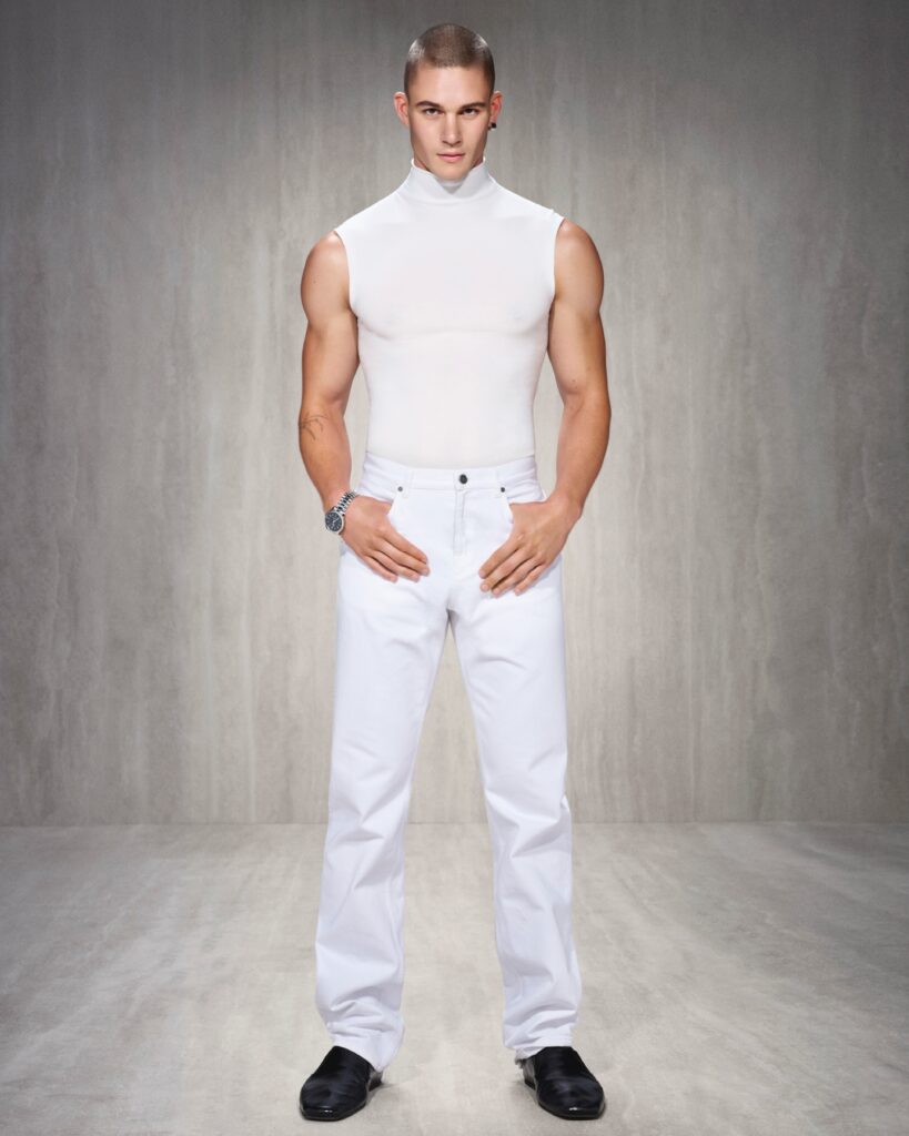 La estatuaria que moldeó mi sensibilidad estética inspira looks estilizados de Adonis que evocan los ideales renacentistas de proporcionalidad y físico. Looks de skater con camisetas fluidas sujetas por un drapeado griego y un vestido blanco ceñido que evoca el Nacimiento de Venus.