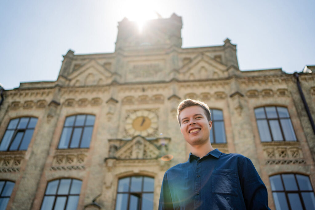 Kyrylo is standing outside of a university hall building wearing a dark navy blue button down shirt. The sun is shining, peeking out slightly over the university hall building's tower, and the sunny sky is a light blue.